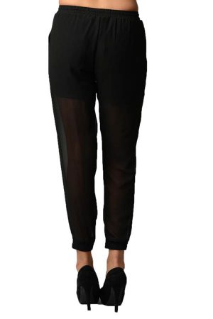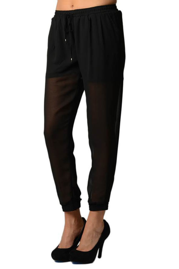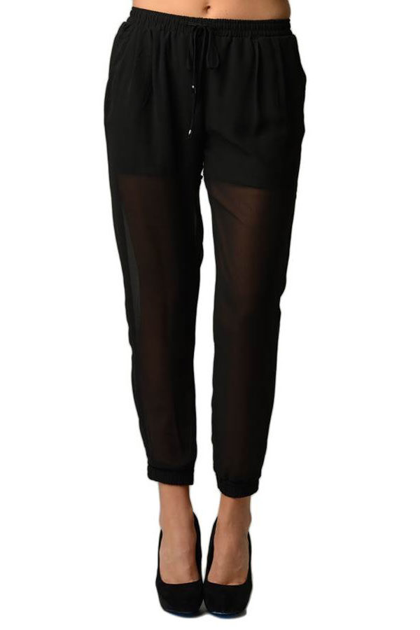 Runway inspired chiffon harem pants. Dress them up with heels or down with flats or a strappy sandal. These pants are breezy for comfort and chic for fashion forward styling. Slim legs. Drawstring pull-on waist; Elasticized Ankle. Smocked waist. Slanted front pockets. Built in shorts. Lightweight.